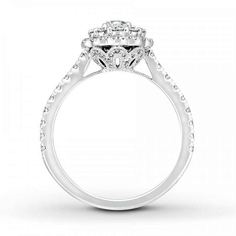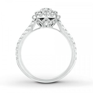 This breathtaking engagement ring? features a shimmering round diamond haloed by smaller round diamonds as the floral-inspired focal point. Additional diamonds grace the 14K white gold band, bringing the total diamond weight to 1 carat.