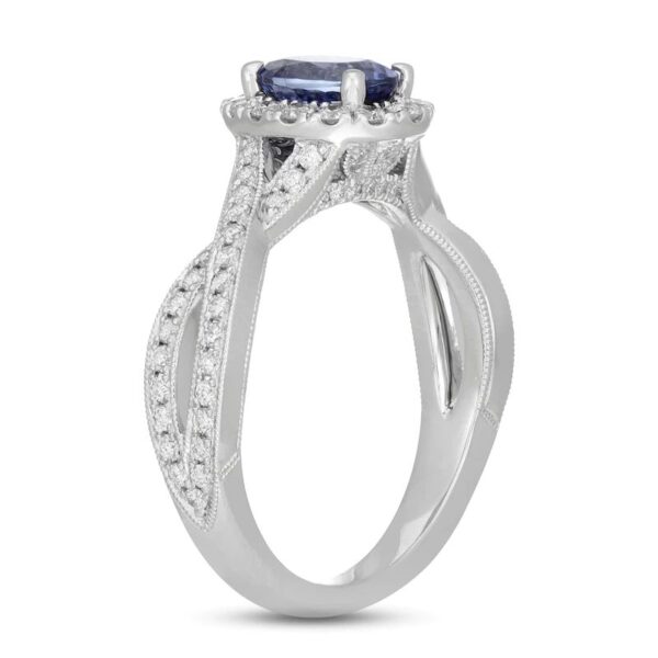 A vivid oval-cut tanzanite draws the eye to this splendid engagement ring. Radiant round diamonds halo the center and shimmer down the twisting 14K white gold band for a total diamond weight of 5/8 carat.
